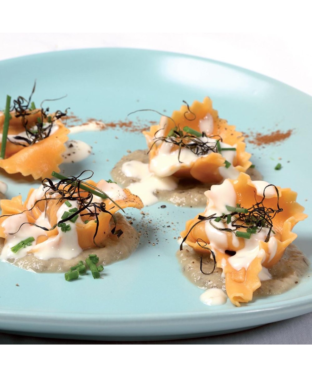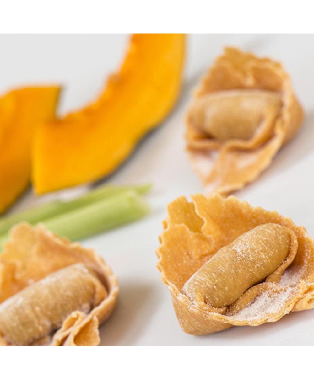 Zutaten der Cucina Mediterranea wie Kürbis, Ricotta, Amaretti, Grana Padano, Hartweizengrieß, Eier und andere italienische Lebensmittel machen aus diesen Teigwaren ein Muss in Ihrer Menükarte. Vegetarische Küche Italien.