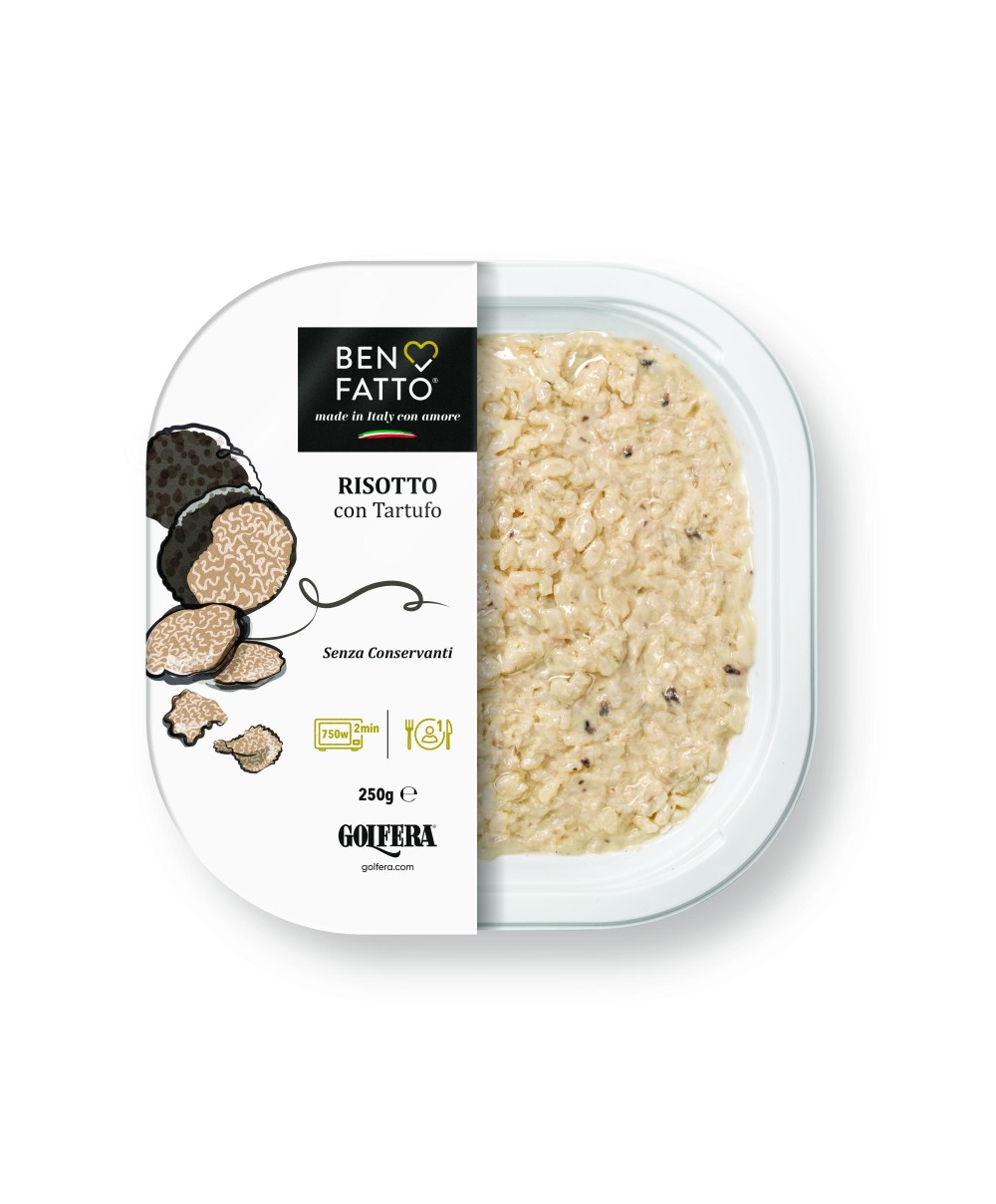 Hochwertiger italienischer Reis mit frisch geriebenem Parmigiano Reggiano DOP 24 Monate und bereichert mit schwarzem Trüffel in Scheiben für einen typischen und unverwechselbaren Geschmack und Aroma. Traditionelle Herstellung. Frisch. Ohne Konservierungsstoffe. Sehr praktisch: In wenigen Minuten zuzubereiten, sowohl in der Mikrowelle als auch im herkömmlichen Ofen. Innovativ: vakuumverpackt und kalt pasteurisiert, um die organoleptischen Eigenschaften zu erhalten. Ein neues, vollständig recycelbares Tablett, das die Umwelt respektiert. Golfera hebt auf dem Etikett auch die Wahl eines neuen, zu 100 % recycelbaren Tabletts hervor. Entwickelt für Gastronomen und Betreiber, die nach einer Lösung suchen, um Gerichte der Spitzengastronomie anzubieten und dabei einen schnellen sowie effizienten Service sicherzustellen.