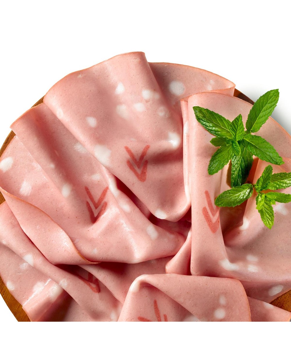 Eine Mortadella mit starkem Geschmack und intensivem Aroma. Rosa Scheibe mit grünen Pistazien.