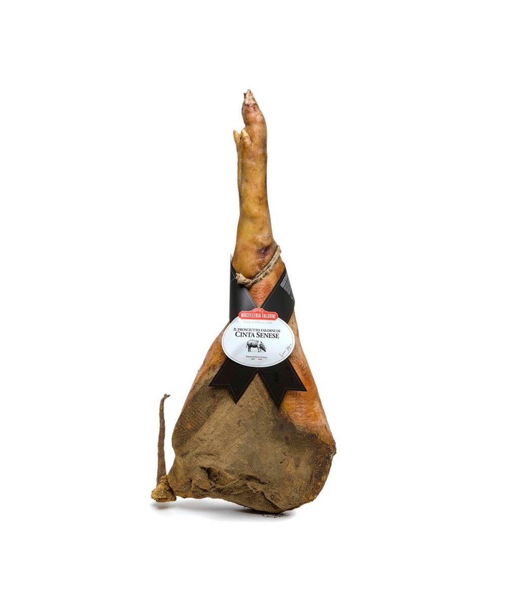 Der Cinta Senese-Schinken mit Knochen und Schwarte besteht aus Schweinefleisch von "Cinta Senese", einer uralten, nur in der Toskana lebenden Rasse, die durch das Engagement einiger weniger einheimischer Züchter vom Aussterben bedroht ist und durch ihre klassische Bande (oder Banderole) aus Haut und hellem Fell auf der Brust, hinter den Schultern, gekennzeichnet ist. Dieser spezielle italienische Charcuterie passt hervorragend zu kräftigen Rotweinen. Sein Fleisch ist mager und trocken, aber mit einem intensiven und langanhaltenden Geschmack gefüllt, während seine bescheidenen Fettteile im Mund schmelzen. Diese Schweine, die im Alter von drei Jahren geschlachtet werden, haben eine "relativ lange" Reifezeit und werden nicht intensiv gehalten. Ihr Fleisch wird in der Toskana 12-24 Monate behandelt und getrocknet; 8 kg Gewicht; gluten- und laktosefrei