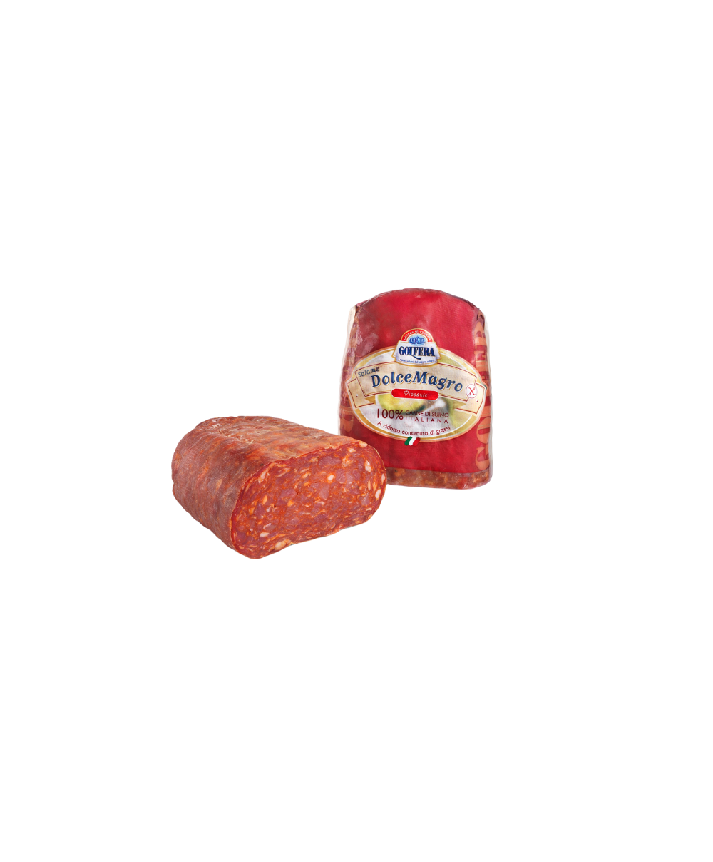 Salami DolceMagro Piccante Golfera is prepared exclusively with fresh meat and made from the leanest cuts of Italian pork. The mixture prepared with selected cuts of pork is flavoured with Italian chilli, which gives the product a bright red color and a pleasantly spicy taste. Highest quality able to combine light and digestibility with a unique and delicious taste with less than 14% fat. Good and delicate thanks to its lightness. Use it to spice up a starter or in salads and sandwiches. DolceMagro is also ideal for the most demanding consumers and particularly attentive to new nutritional trends. Vacuum packed in a presentation of 1.6 Kg. Produced in Emilia Romagna and prepared with iodine-enriched salt. Low fat and gluten free.
