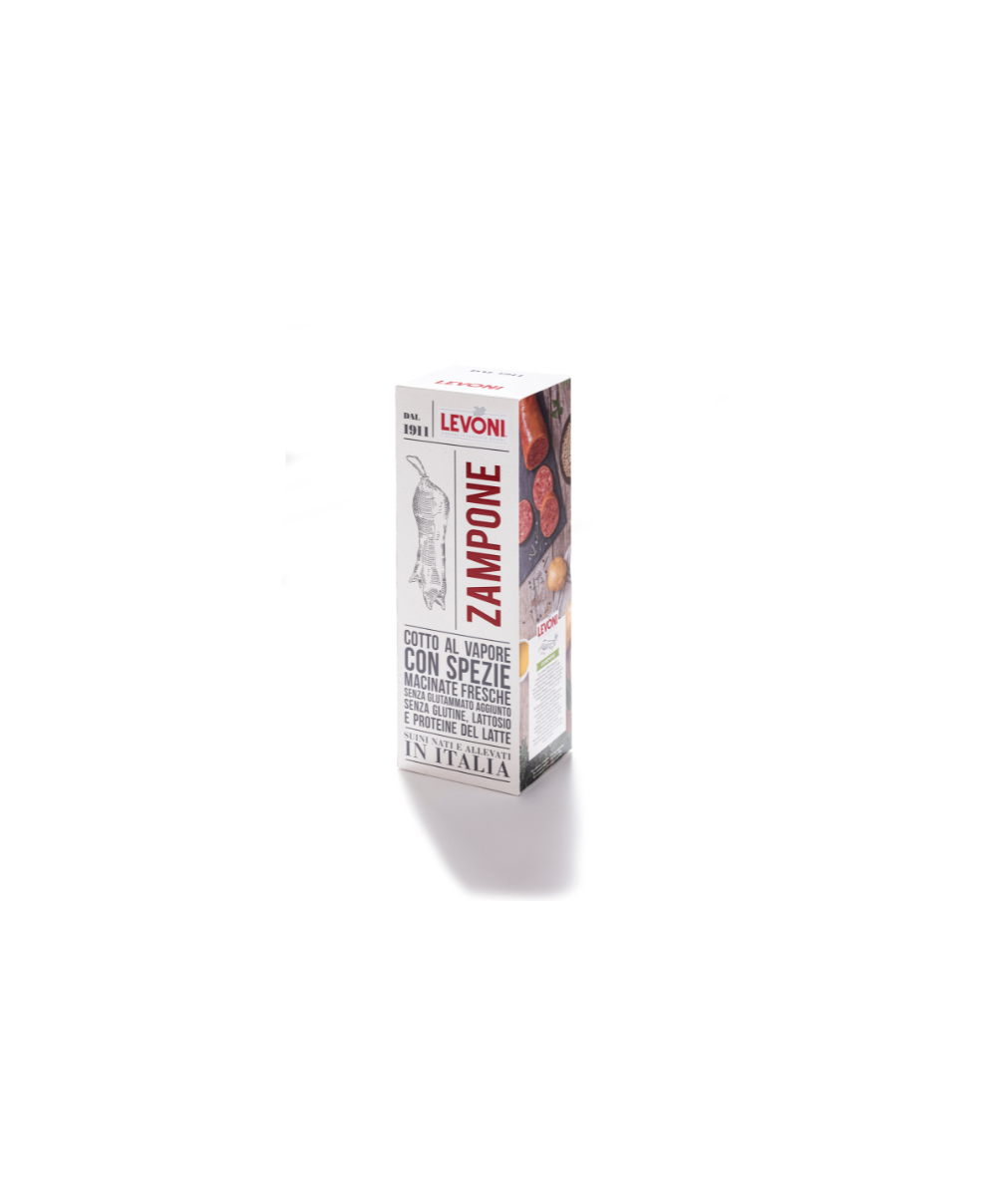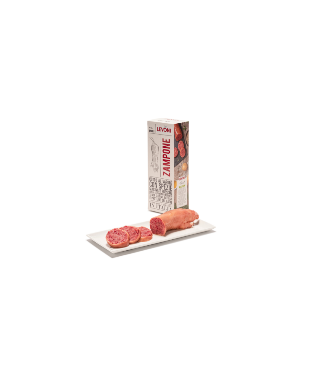 Meat from pigs born and raised in Italy. At the first scent, the olfactory stimuli take you back to the past. The spices and cooking of the meat capture the notes of childhood: the particular and incomparable consistency, the minced and traditionally flavored meats for an appetizing and delicious classic. Completely natural flavoring according to an exclusive Levoni recipe. Casing: front limb of pig. Pre-cooked before packaging. Without milk proteins. Without added glutamate. Preparation tips: fill a pot with water and immerse the closed bag in it. Bring to the boil. Boil for 30 minutes. Before serving, allow the liquid formed in the bag to drain.