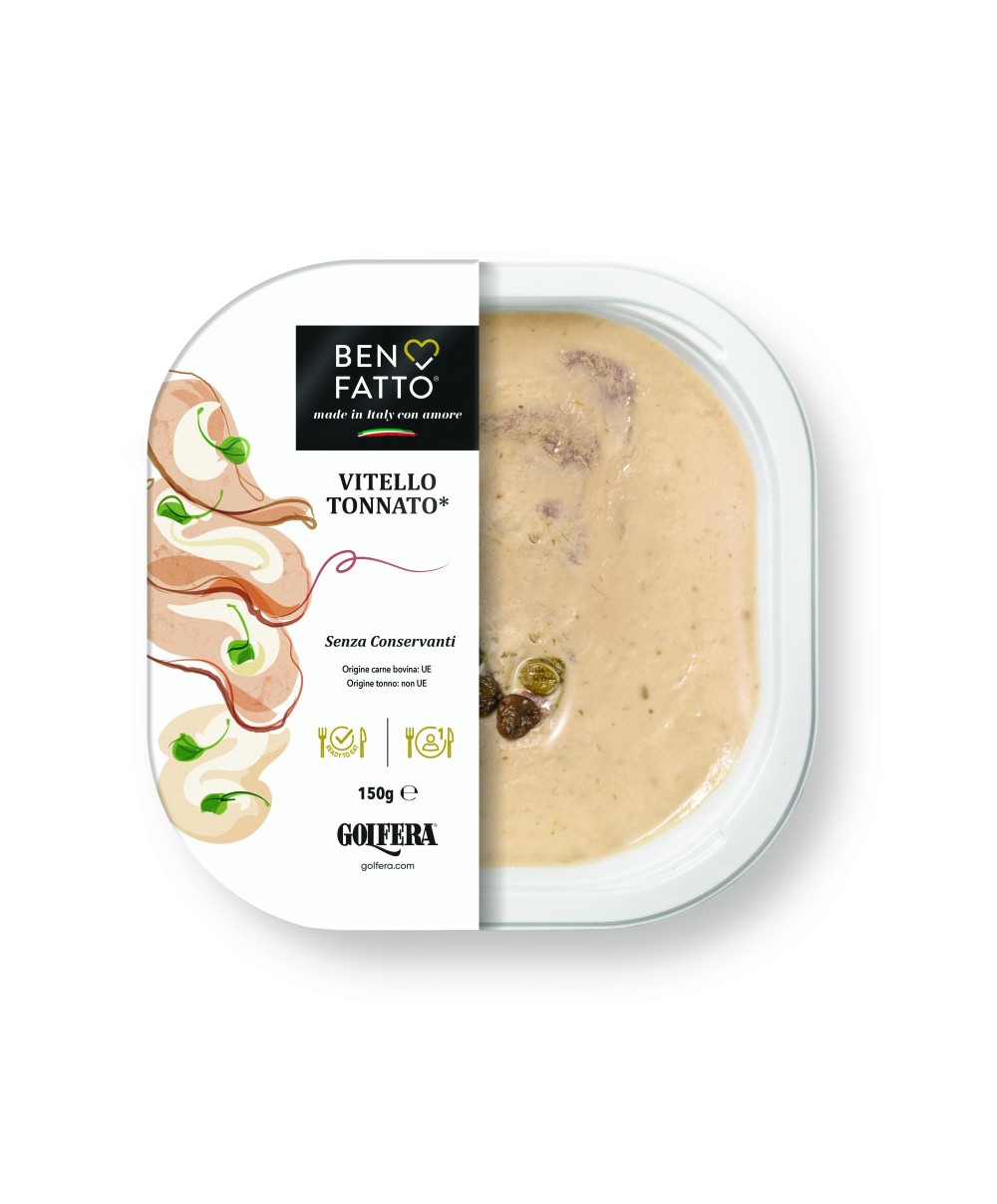 Précieux médaillon de veau italien cuit et émincé une fois refroidi. Enfin, il est éparpillé d'une sauce au thon de la plus haute qualité et de mayonnaise à base d'œufs italiens des poules élevées au sol, de câpres et d'anchois. Vitello Tonnato est le plat froid de la cuisine italienne traditionnelle. Artisanals. Frais. Sans conservateur. Très pratiques. Innovants: Emballé sous vide et pasteurisé à froid pour maintenir les caractéristiques organoleptiques. Un nouveau plateau entièrement recyclable, respectueux de l'environnement. Golfera met également en avant sur l'étiquette le choix d'une nouvelle barquette 100% recyclable. Conçu pour les restaurateurs et tous les opérateurs à la recherche d'une solution permettant de proposer des plats gastronomiques haut de gamme tout en assurant un service rapide et efficace.