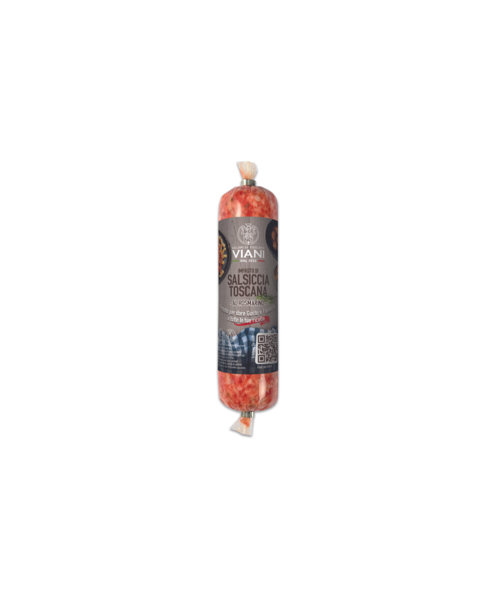 Le mélange de saucisse toscane au romarin produit par l'usine de charcuterie de Viani est fabriqué exclusivement avec du porc. Dans cette variante de la saucisse classique, encore plus particulière et délicieuse, du romarin est ajouté au mélange de porc maigre et gras. Comme dans la recette traditionnelle, vous pouvez percevoir les saveurs de l'ail, du poivre, de différentes épices et des arômes naturels, avec le parfum du romarin en plus. Le produit est à consommer après une cuisson minutieuse et est élaboré avec de la viande hachée de porc d'origine européenne, dont la traçabilité est garantie par l'apposition du lot sur l'étiquette. Vous pouvez servir ce plat en plat principal ou en apéritif, accompagné d'une tranche de pain grillé. La saucisse sera meilleure si elle est préparée sur le grill, mais elle peut également être cuite d'une autre manière. La saucisse au romarin toscane ne contient pas d'ingrédients allergènes, elle se caractérise par une couleur rose vif, une saveur fraîche et un arôme intense, grâce au romarin. Le produit doit être consommé dans les 28 jours suivant l'ouverture de l'emballage (car il est vendu sous vide). Achetez maintenant 250 g de mélange de saucisse toscane au romarin : chez NATURALEITALIANO nous nous engageons à livrer le produit dans un délai maximum de 48 heures, dans tous les pays du monde.
