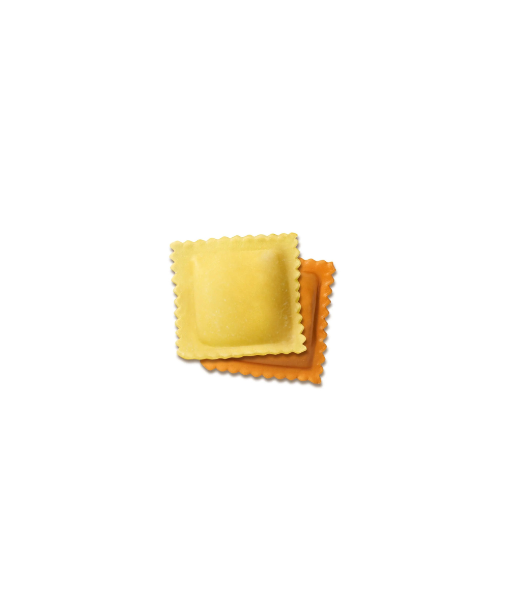 Pâte (50%) : semoule de BLe dur, ŒUFS de poules élevées au sol (20% dans la pâte ; 10% au total), farine de BLe tendre, eau, sel. Pâte rouge avec ajout de concentré de tomate (6% dans la pâte). Farce (50%) : mozzarella de LAIT de bufflonne (LAIT de bufflonne, sel, présure) (30% de la farce ; 15% au total), tomates pelées (23% de la farce ; 11,5% au total), chapelure (farine de BLe tendre type "0", levure de bière, sel), fromage Edamer, huile d'olive, sel, origan, conservateur : E200. Saupoudré de farine de riz.