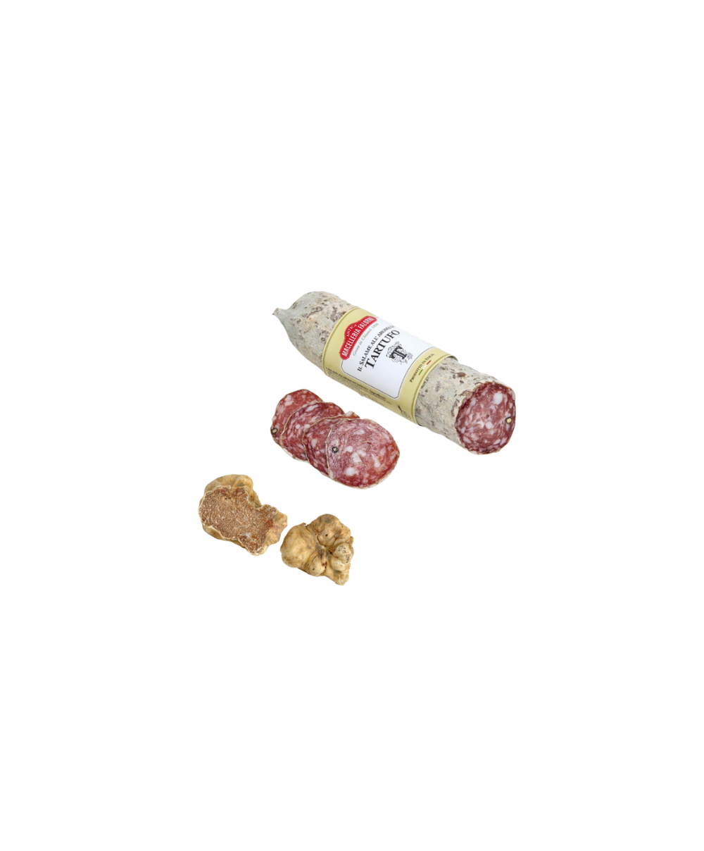 Salume leggero ed aromatizzato al tartufo, intenso e delicato al tempo stesso. Salame preparato con carni di maiale fresche, finemente macinate ed impreziosite dall'aggiunta di prezioso tartufo bianco italiano grattugiato (un vero tesoro del nostro territorio). Un salame perfetto per uno snack fresco e gustoso, meglio se accompagnato dal pane bianco toscano. Sottovuoto, 350 gr. Prodotto in Toscana. Senza glutine