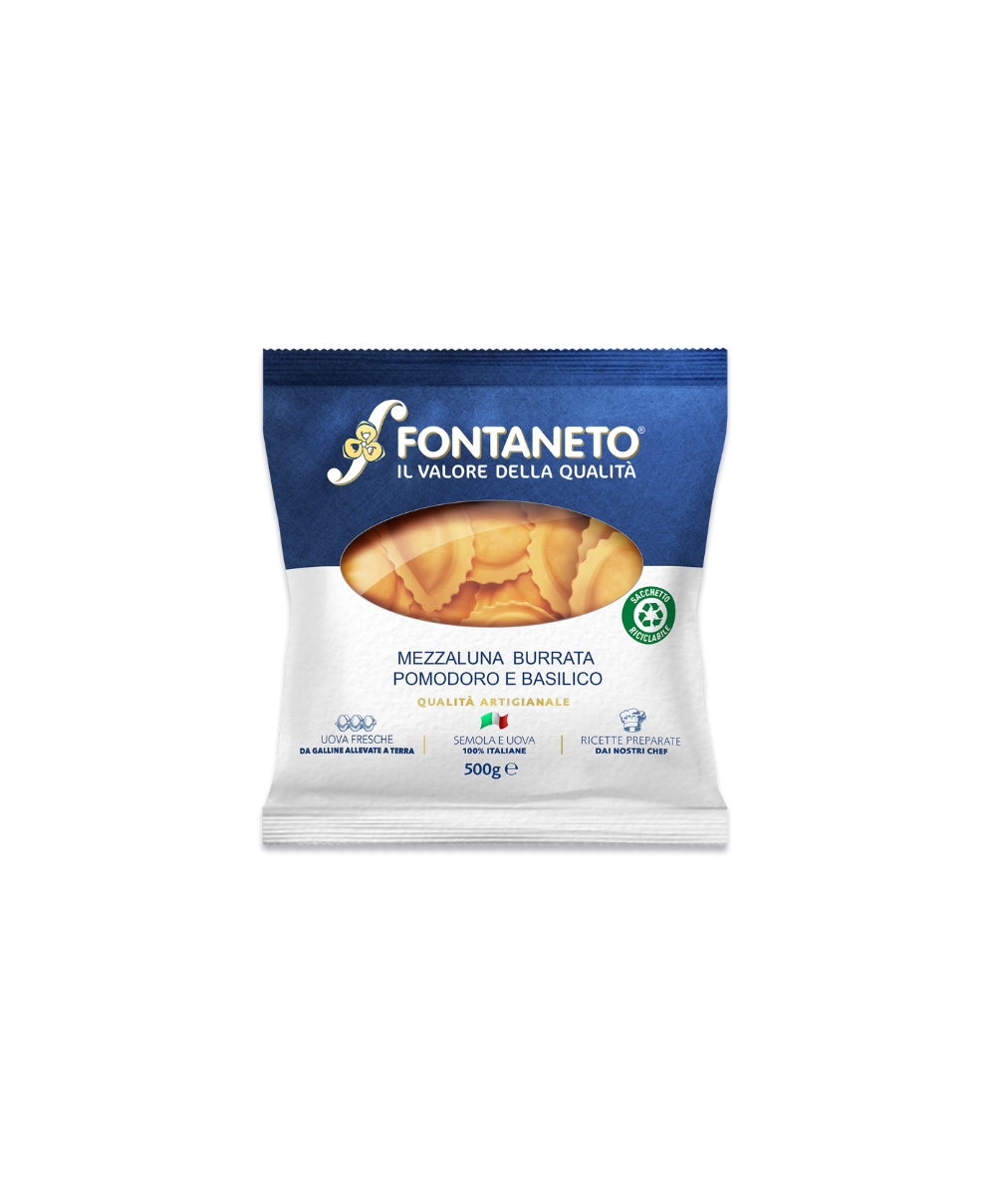 FONTANETO Ravioli Mezzaluna ripieno burrata, pomodoro e basilico - 4 x (27~ x 18 g 500 g) 2 kg - TMC 3 settimane - 5 minuti d