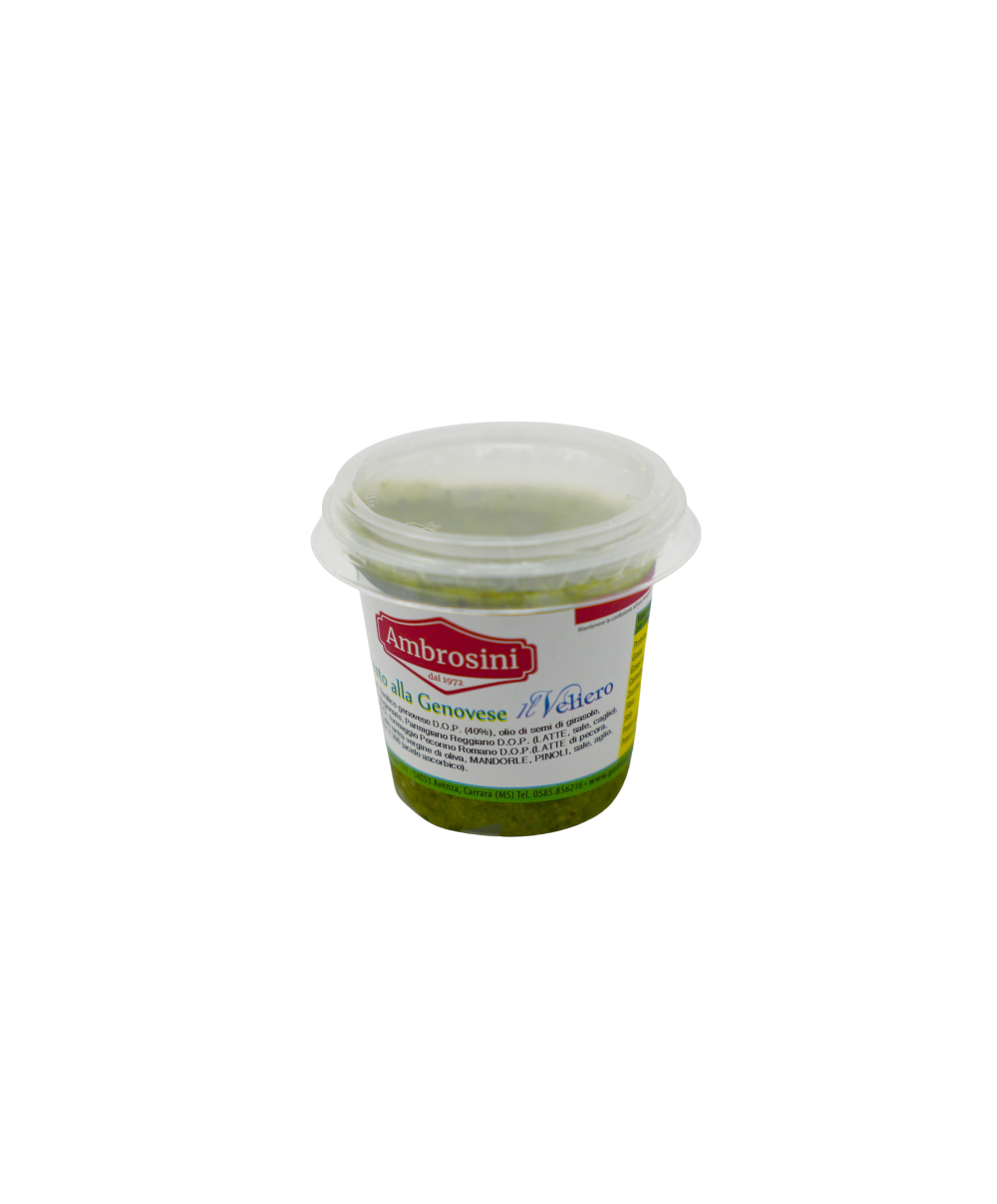 Il pesto alla genovese Il Veliero è caratterizzato da ingredienti di prima scelta. Grazie alla presenza di una piccola percentuale di burro tra gli ingredienti con i quali é realizzato, questo prodotto è apprezzato soprattutto per la grande cremosità e l’aroma intenso di basilico. Il pesto alla genovese “Il Veliero” é realizzato con basilico genovese d.o.p., é ideale per il condimento di pasta fresca o secca, si distingue per il sapore e profumo intenso tipico del pesto alla genovese artigianale. Indicazione: cuocere la pasta in abbondante acqua salata, quasi a fine cottura amalgamare il pesto alla genovese “Il Veliero” (50 grammi a persona circa) ancora freddo con poca acqua di cottura e versare sulla pasta appena scolata. Ottimo anche per crostini e tartine.