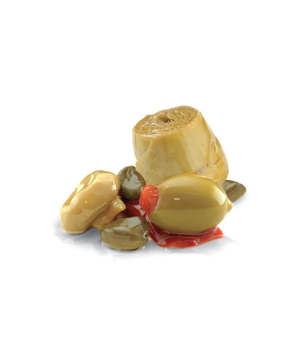 Miscela di vegetali in proporzione variabile (olive farcite con peperone, carciofi, funghi "Agaricus bisporus", peperoni rossi, capperi, addensanti: E401-E412), olio di girasole, sale, zucchero, aceto di vino bianco, correttori di acidità: acido citrico e acido lattico, antiossidante: acido ascorbico.